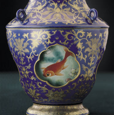 Revoloving-center vase with fish decor in cobalt blue with gold tracery