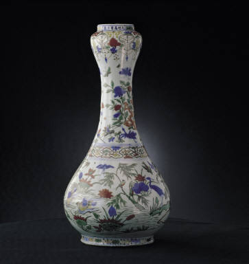 Garlic-head vase with flower and bird decor in wu-cai glaze