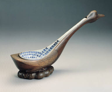 The ladle has an elongated handle and a shallow bowl. On the exterior, 24 lotus blossoms painted in cobalt blue lie along the border. A Sanskrit character, which refers to a bodhisattva, locates in the center, and it is encircled by five lines of Sanskrit; three lines of such characters extend to the handle, and the middle line is longer than the other two. The blue pigment is brilliant, and the dark, ferrous specks appear throughout the ladle. The clear glaze shows a blue tinge.