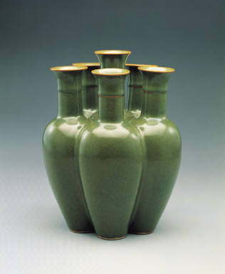 This vase is a conglomeration of five vases adjoining to the middle vase. All six compartments have the same size, and their bases align uniformly on the ground. The five outer vases expose the same surface area, and they are hollow inside. The middle vase is solid from shoulder to foot, perforated in a few places, and attached to the five outer vases. The six necks are made separately and attached to the body thereafter. The teadust glaze is basically green, and it appears brownish yellow in the rim and neck where the glaze runs thin on the edges.