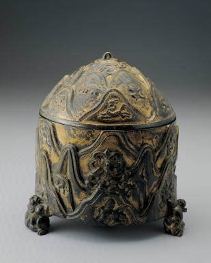 This vessel has a simple shape with three animal feet. What is more worth noting are themes depicted on it. The lid and the vessel create an integrated relief that depict mountains overlapping one another. Within the relief of mountain ranges are the reliefs of people, birds and animals, all of which reflect the liveliness of natural landscape as described by Han artisans. This vessel is in gilt-bronze, and due to the irregularity of the surface which has made the gilding process more difficult, much of the gilding has fallen off.