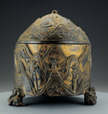 This vessel has a simple shape with three animal feet. What is more worth noting are themes depicted on it. The lid and the vessel create an integrated relief that depict mountains overlapping one another. Within the relief of mountain ranges are the reliefs of people, birds and animals, all of which reflect the liveliness of natural landscape as described by Han artisans. This vessel is in gilt-bronze, and due to the irregularity of the surface which has made the gilding process more difficult, much of the gilding has fallen off.