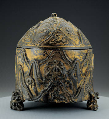 This vessel has a simple shape with three animal feet. What is more worth noting are themes depicted on it. The lid and the vessel create an integrated relief that depict mountains overlapping one another. Within the relief of mountain ranges are the reliefs of people, birds and animals, all of which reflect the liveliness of natural landscape as described by Han artisans. This vessel is in gilt-bronze, and due to the irregularity of the surface which has made the gilding process more difficult, much of the gilding has fallen off.