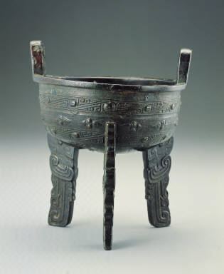 his vessel has a shallow belly, with three flattened feet, which has a evolved from the flat-footed potteries of the Neolithic period. Its surface is severely oxidized, covering the original golden color. In the middle of the belly is a band of horizontal cicadas pattern. The bodies of the cicadas are raised, and the background is decorated with diagonal-eyed thunder patterns. On the flattened feet are bird motifs in the shape of an owl, a pattern often seen in the late Shang.