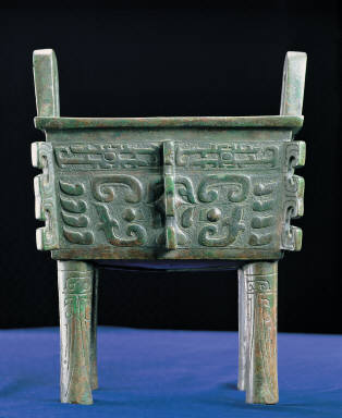 The four corners and the central lines on the four sides of the ding all are decorated with raised vertical ridges. The belly is primarily occupied by simplified animal mask motifs, and the four columnar feet are each decorated with the cicadas motif. Six characters in two columns are inscribed in one of the inner walls of the belly. The inscription is transcribed Kang ho fengzuo bozun. Feng is the name of emperor Wen of Zhou's ninth son, the youngest brother of emperor Wu. When emperor Wu extinguished the forces of Shang, he granted Feng the position to govern the kang region, and named him the marquis of Kang. When Emperor Wu passed away, the crowned prince succeeded him, and became emperor Cheng. When emperor Cheng again conquered Shang forces, he changed the name of the old Shang regions to Wei and designated this region to be under the administration of his uncle the Marquis of Kang, whose title by now had become uncle Weikang.