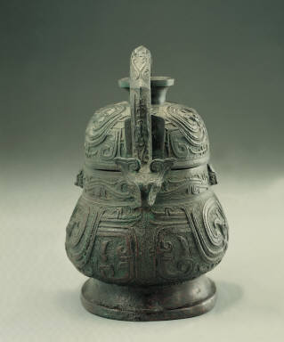 This wine vessel is short and robust. Two ends of its lid jut out in triangular shapes. Its belly bulges towards the bottom, and the two sides of its swing-handle are made into three-dimensional animal heads. Both the surface of the lid and the belly are decorated with four pairs of phoenixes that form a spiral pattern. The lively and animated quality they convey is the unusual beauty of this piece. The legendary phoenix of ancient China are in fact today's peacocks. The neck area below the rim of the vessel is further decorated with long-tailed birds, again confronting each other in pairs.Identical inscriptions of four characters are inside the lid and in the inner bottom of the belly, indicating its respectful usage as a ritual vessel for ancestral worship. The content of the inscription does not specify to which ancestor the vessel is dedicated; therefore it is probably made for a more general use in the ancestral temples.