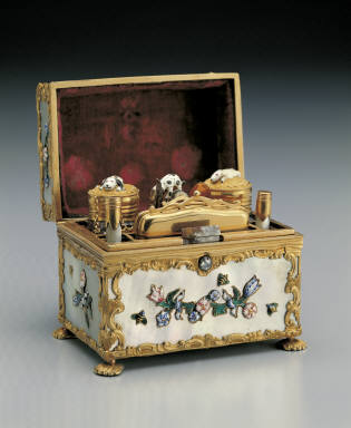Gilt box inlaid with shell contains cosmetic bottles, knife, etc.