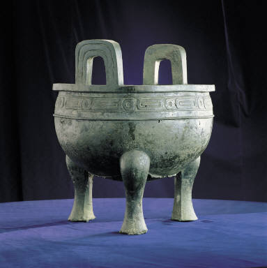 Mao gong ding has a belly in a semi-spherical shape and firm and sturdy legs in the shape of ox hooves. Its clear and simple ribbon patterns, although seemingly naive and unrefined, is nevertheless typical of the style of a late Western Zhou ding.The 500-character inscription can be divided into seven parts. The main gist is as follows: when emperor Xuen of Zhou ascended to his throne, he desired to make progressive reforms in the court, and therefore appointed his uncle, Duke of Mao, to be the prime minister to govern domestic and foreign policies, and from general matters to meticulous details. And seeing that the excellent duke was impartial and public spirited, he ordered the people from Mao's clan to become the palace guards. Moreover, the emperor awarded Duke of Mao with large sums of treasure. To show his gratitude for the emperor's generosity, the Duke of Mao cast this bronze ding to pass on to his descendents so that they could commemorate this event and cherish the vessel forever. From the content of this inscription, one can assume that Mao gong ding was made in the beginning years of emperor Xuen's reign (827 B.C), therefore, it pre-dates the Shangshu Book of Documents. Because of this reliable and significant historical record about the Western Zhou, Mao gong ding is known as a world-class treasure.