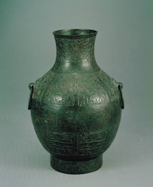 In between the three registers of hunting scenes are four registers of T-shaped hooks and cloud patterns, including the band of decorations on the ring foot. The belly is decorated with two registers of hunting scenes, and each scene is divided vertically by fabric patterns in diamond shapes. The entire vessel is covered in red copper inlay, and some still remain on the surface today.