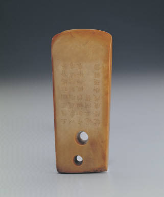 This jade ax shows a beautiful, warm yellow tinge on the surface, probably because it has been handled for so long. It is slender and trapezoidal in form, and it has two perforations on one end. Near the sharp edge, there is a large, oval, sheared area, on which there remains shearing marks. The sharp edge divulges a curvature, and is chipped on three spots. From the chip marks and other traces, this ax was functional, and it might have been used to chop wood and plough land.From the form and the characteristic of this jade, it can be dated to 2000-3000B.C.E., and it was probably used by inhabitants of the lower Yellow river region in the late Neolithic period. In the Qing Dynasty, it became a treasure in the collection of the Qianlong emperor. In the first two years of the Jiaqing period (1796-97) when Qianlong became the retired grand-emperor, he composed two poems for it. The poems were inscribed on the surface, and the jade was matched with a zitan wood stand.