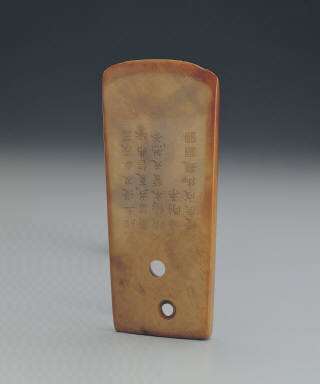 This jade ax shows a beautiful, warm yellow tinge on the surface, probably because it has been handled for so long. It is slender and trapezoidal in form, and it has two perforations on one end. Near the sharp edge, there is a large, oval, sheared area, on which there remains shearing marks. The sharp edge divulges a curvature, and is chipped on three spots. From the chip marks and other traces, this ax was functional, and it might have been used to chop wood and plough land.From the form and the characteristic of this jade, it can be dated to 2000-3000B.C.E., and it was probably used by inhabitants of the lower Yellow river region in the late Neolithic period. In the Qing Dynasty, it became a treasure in the collection of the Qianlong emperor. In the first two years of the Jiaqing period (1796-97) when Qianlong became the retired grand-emperor, he composed two poems for it. The poems were inscribed on the surface, and the jade was matched with a zitan wood stand.