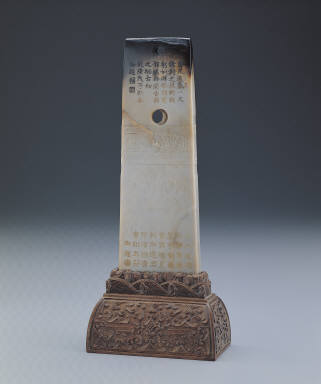 A fine and opaque yellow stone with a grayish tinge, the handle of this plaque is black, and the sharp edge is reddish brown. The form is slender and trapezoidal, and the cross-section is rectangular. The handle has two holes, and an emerald may have been sewed on the hole that is closer to the edge. The sharp edge is straight, and it is unused. Literary sources call this type of ritual wares that derive its form from axes and spades "gui," and it is a status symbol.The middle section of both sides indicates a delicate, low relief. The sharp edge must face upward for the motif to face the viewer. The motif is divided into two parts, and the upper part is a facemask carved with two large eyes whereas the lower part is a rectangular band carved with an abstract facemask.