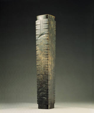 This large jade cong was acquired by the palace probably in the 19th century, since it is not inscribed with a poem by the Qianlong emperor. It is a carved nephrite of dark green color with reddish splashes of varying tints. The surface exhibits sunken marks left by the initial chiseling of the nephrite. The form is a tall, squared, and top-heavy column. It is drilled hollow from both ends, and the meeting point is not perfectly aligned. The top rim is slightly flared and the bottom rim is straighter. The four corners of each section feature small-eyed masks. There are 17 sections and 68 masks in total.