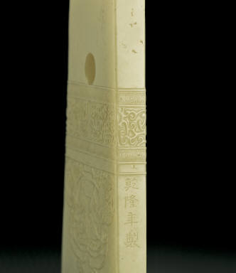 Jades mined in Hetian, Xinjiang province, are often used to make Qing archaistic jades, and this piece is no exception. It takes the form of slender trapezoid, and the blade edge is thick and blunt. An abstract facemask is carved on one side, and it is in opposite direction from a poem composed by the Qianlong emperor. The other side shows a figurative image with big eyes and fangs. It wears a boat-shaped hat and round earrings, which are linked to a human head. The imitations are very accurate, and the structure does not have sloppy flaws that show on most imitations. The two edges are inscribed with "Qianlong nianzhi" and "yunzi sanshisan hao".