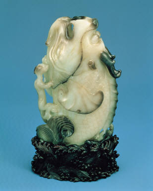 This carp flower vase has a fish body and a dragon head, which opens it mouth to hold flowers. A small dragon accompanies the carp. Carp is an epithet of a big "trionyx sinenis" and carp has a connotation of leaping over the dragon gate and transforming into a dragon. The flower vase is carved of a freckled white jade, and the artisans cleverly used the brown specks to adorn the whiskers, mouth, and back fin, thereby making the jade carving more prominent. Moreover, the meticulous carving enhances the elegance of the vessel. It is truly a masterpiece of the Ming Dynasty.