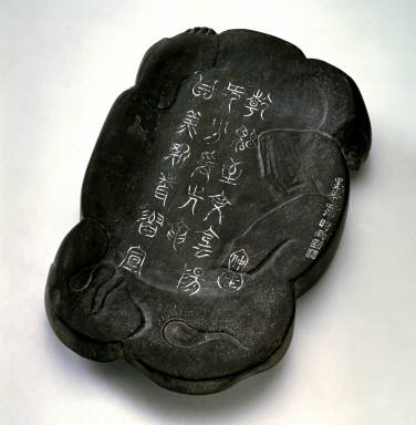 The ink-slab is sculpted into the shape of a coiled dragon. Made of Deng soil, the ink-slab is yellow with a tint of purple shade. The ink-face is shaped into a circle, and thus imitates a pearl held (or played) by the coiled dragon. The dragon's mouth opens to the ink pool to imitate a posture of causing turbulent wind and scattering rain. On the back of the ink-slab, a carved inscription is visible: The ink and pen move like timely rain. Two round stamps inscribed with "Qian" and "Long" (Qianlong together) follows the inscription. The back imitates the dragon's abdomen, on which another inscription is engraved. The inscription is followed by an endorsement of two zhuan-shu (seal style) characters, Laozhuan, and a seal of Zhongqui.