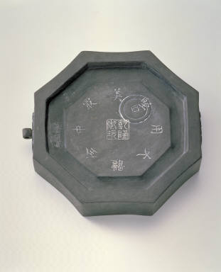 The ink-slab is made of duan stone and imitates the shape of the Eight Diagrams. The left and right sides have sculpted decoration of the face of a beast and a fastening knob. The left knob is broken off. The three sinks situated on the upper part are water holders for moistening brushes. Each is 0.4 cm deep. A channel is dug on the surrounding of the inkstone, and the shallow depression in the middle is the ink-face where ink is ground. On the upper part of the inkstone, two li-shu (square style) characters are incised, "Guan" and "Xian" (which means observing the stars). On the rim of the upper part, there are two chased li-shu (square style) characters, "Tang" and "Xian" (Inkstone from Tang period). The ink-slab back has a depression of 0.6cm depth, and on the surrounding is a chased palindrome inscription in yauqiti, a writing style dated back to Liang Dynasty. The palindrome writes, "Solid and majestic, the most beautiful of all." The middle is carved with four characters, "An object for amusement of Qianlong." The upper right side has faint traces of pre-chin bronze coin decoration.