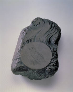 The entire inkstone is sculpted to form an image of a blazing sun in the middle of the howling sea. The blazing sun serves as the ink-face, where the ink is ground, and the swirling sea as the inkwell. The inkstone is greenish purple, and its texture appears refined and lustrous. The piece reveals a tinge of natural and elegant aura. The back of the inkstone is also decorated with a rising sun in the midst of a swirling sea. In addition, a bird with three legs is embossed in the middle of the sun to form an impression of showering sunrays. The sculpture reveals prudent and elaborate craftsmanship of the sculptor, yet the inkstone still appears simple and elegant. An inscription can be seen on the flat surface on the right side of the inkstone. The inscription is a poem by Qianlong and is carved in li-shu (square style).