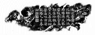 The entire inkstone is sculpted to form an image of a blazing sun in the middle of the howling sea. The blazing sun serves as the ink-face, where the ink is ground, and the swirling sea as the inkwell. The inkstone is greenish purple, and its texture appears refined and lustrous. The piece reveals a tinge of natural and elegant aura. The back of the inkstone is also decorated with a rising sun in the midst of a swirling sea. In addition, a bird with three legs is embossed in the middle of the sun to form an impression of showering sunrays. The sculpture reveals prudent and elaborate craftsmanship of the sculptor, yet the inkstone still appears simple and elegant. An inscription can be seen on the flat surface on the right side of the inkstone. The inscription is a poem by Qianlong and is carved in li-shu (square style).