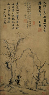 Zhao Mengfu has located the rock at the heart of his painting. To the side grow three withered trees and several new bamboo. At the center the withered trees and bamboo groves reveal, then conceal the large rock. Zhao has used the technique called "flying white" to depict the rock. The brush rises and falls, twisting and turning. Vigorous and strong, it renders the hardness and solidity of the rock, and nothing is lost. The method of depicting the trees, which adopts the techniques of writing seal script calligraphy, is accomplished and effectively conveys the old tree's hoary, mottled appearance. In drawing the withered tree's tender new growths, the brushwork is rapid, the brush firm. The sections of the bamboo are rounded and vigorous, the ink tones rich. In painting the bamboo leaves, the brush rises and falls with purpose, like the eight strokes making up the character "yong" in standard script. Even for the various grasses on the slope, Zhao's use of standard script brush strokes demonstrates an accomplished method. Even though this painting depicts concrete subject matter, the more important element is the artistic resonance resulting from the use of the calligraphic methods. Trees and Rock is a concrete embodiment of Zhao's philosophy that calligraphy and painting share the same origin.