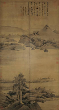 The Old Fisherman is by Wu Zhonggui (Wu Zhen's style name). Using unusually dark ink, he paints in the style of Juran. Although the brushwork is abbreviated, it nonetheless is full of meaning. This painting depicts an autumn river at dawn on a clear day. Only a single boat is out. Beneath two trees in the foreground there are only two trees, a grassy path leads to a pavilion. On the opposite bank, the hills rise and fall. A little stream winds about. Not a single one of Wu's brushstrokes is wasted.