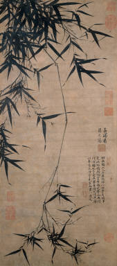 The Qi and Wei Rivers (Bamboo) depicts a branch of bamboo hanging upside-down in an attractive posture. The brushwork is related to that of Wu Zhen. Using pale ink to draw the bamboo stalk and dark ink for the leaves, Wang Fu captures the sense of the infinite variety of stalks and leaves. On this painting, Liang Qian has added an inscription, "On this sheet of paper, we see this little something/But it contains the strength of a thousand mu of mist and clouds/It is as if we are in the gardens of the Wei and Qi Rivers" The "Wei and Qi Rivers" referred to in the inscription are also the reference in the title of this painting. "Wei chuan" is mentioned in the "Biography of Huozhi" in the Shiji, which states that when we say that someone has a thousand mu of bamboo in "Wei chuan" [today, the Wei River in Gansu province], it means that the person has wealth equivalent to an enfeoffment of a thousand households. Later, because the bamboo of Wei flourished, people gave Wei River the nickname, "a thousand mu." "Qiyuan" is the name of a place, which today is near Qi county in Henan province. In the past, it was famous for its bamboo production.