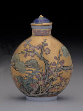 Glass bodied painted enamel snuff bottle with three winter friends design