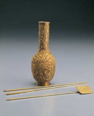 Gold vase, chopsticks, and shovel