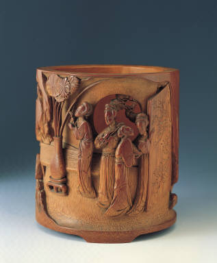The sculptor of this brush-holder used two motifs, the pine tree and the big rock, to separate two spatial orientations, the interior and the exterior. The pine tree stands outside in front of a round window, within which a group of four maidens in different postures are sculpted. A maiden stood behind the door-screen and looked back to talk with another one who is holding a book. The two seems to be discussing the carving of a Tung tree on the divider. Holding a ruyi, one maiden is appreciating a lotus plant in a vase with another maiden. There is also a long bed laid with a sitting mat inside the room. Both patterns on the sitting mat and the vase are carved in detail. Under the rock that sits outside, three maidens are leisurely resting. One sits on a sitting mat and plays a flute. Another one sits on the rock to play a stringed instrument. This maiden's head is held high and thus her countenance is distinguishable. One holds a fan and stands under the pine tree. On the rock, a kai-shu (regular style) inscription, "San-song," can be identified.