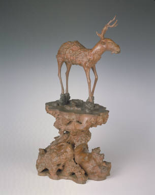 The deer is shaped and carved from natural tree roots. The knobbles imitate the natural patterns on the deerskin (with some artificially glued). In the mouth the deer holds a lingzhi, which are two pieces glued separately on each side of the mouth. The head has two ears, and two horns that are made from natural tree buds. With its long legs, the deer stands on a pedestal that imitates a rock. The stand is also made of natural tree roots, whose top and bottom are glued a piece of smooth board. The deer and the stand are sculpted from roots that come from the same type of tree and the same carving technique and thus reveal a harmonious aura. "Deer" and "emoluments" in Chinese characters are phonetically the same, and thus the deer symbolizes emoluments. Legendarily, the deer is also a heavenly animal.