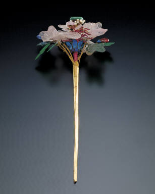 Gilt silver hairpin with floral decoration inlaid with tourmaline and jadeite