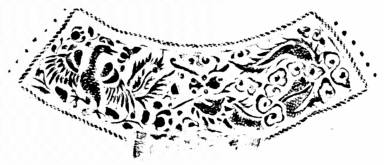 A Ruyi with three inlays. The cloud-styled head is inlaid with a fresh green jade on which the pattern of cloud and dragon is embossed. The stem bulges in the middle and is inlaid with a rectangular jade with indented corners. The jade is embossed with lake pebbles, bamboo shrubs, and two badgers which symbolize "happy together." The tip is elliptical and has an inlay of a rectangular jade with indented corners. On the jade, a phoenix and a dragon are embossed. Each jade sits on an inlay-stand that is composed of two levels. The upper level on each stand is enchased with an auspicious pattern such as, 1) the three-stars map, 2) Magu offers a birthday wish, 3) pine tree with a crane (to symbolize longevity), and 4) fortune and emoluments patterns. The lower level is decorated with five-pedal flowers made of gold beads. The stem is decorated with a pattern of alternating bats and the character shou (which means longevity), and other ornamental objects such as gourds, lychees, mahogany tree and peaches. Rims on the stem are decorated with five-pedal flowers made of gold-beads.