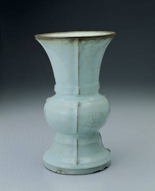 Employing the bronze shape of zun, which is characterized by a trumpet mouth, a round body, and a flaring foot, this vase is made of three separate parts -- the neck, the body, and the foot. It is divided into four sides by four stripes extending from the rim to the foot. Along the stripes are four jutting knobs, which accurately follow the design of the ancient bronze zun. Among extant southern Song Kuan wares, this is the only zun-shaped vase.