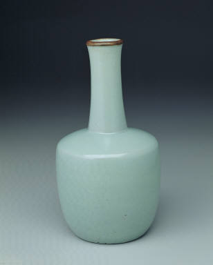 This vase has straight walls and long neck and is shaped like a wooden hammer, thereby earning the title "hammer vase". Since the rim is chipped, it is ground and affixed with a copper rim, whereas the original rim was supposed to be a flat flange. This shape can be found in lacquer, glass, and metalwork made in the Song Dynasty. Among ceramics this shape is made in Ding kilns and Longquan kilns, but the contour of the vases produced in these kilns are not as gentle as this vase, which is characterized by a rotund abdomen, a dropping shoulder, and a slightly waisted neck. The light blue glaze is opaque and crackled. The base reveals marks of small pegs that were used to support the vase during the firing process.