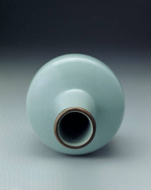 This vase has straight walls and long neck and is shaped like a wooden hammer, thereby earning the title "hammer vase". Since the rim is chipped, it is ground and affixed with a copper rim, whereas the original rim was supposed to be a flat flange. This shape can be found in lacquer, glass, and metalwork made in the Song Dynasty. Among ceramics this shape is made in Ding kilns and Longquan kilns, but the contour of the vases produced in these kilns are not as gentle as this vase, which is characterized by a rotund abdomen, a dropping shoulder, and a slightly waisted neck. The light blue glaze is opaque and crackled. The base reveals marks of small pegs that were used to support the vase during the firing process.